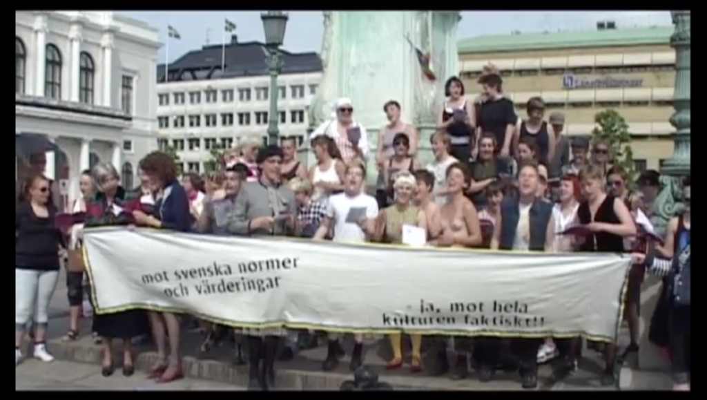 ”Vi finns i hyddor bland träden i Majorna och i Färjenäs skogar. Du hör våra röster från olika håll i stan. Vi sjunger, dansar, hånglar och skriker oss fram på Gustav Adolfs Torg, Götaplatsen, Kungsportsplatsen, i Biskopsgården, Brunnsparken och längs Avenyn. Vi finns överallt precis som Eva Warberg sjunger i filmen ”Överallt” av Christina Kjellsson och Owe Dahlström, om RFSL Göteborg från 1995.”
